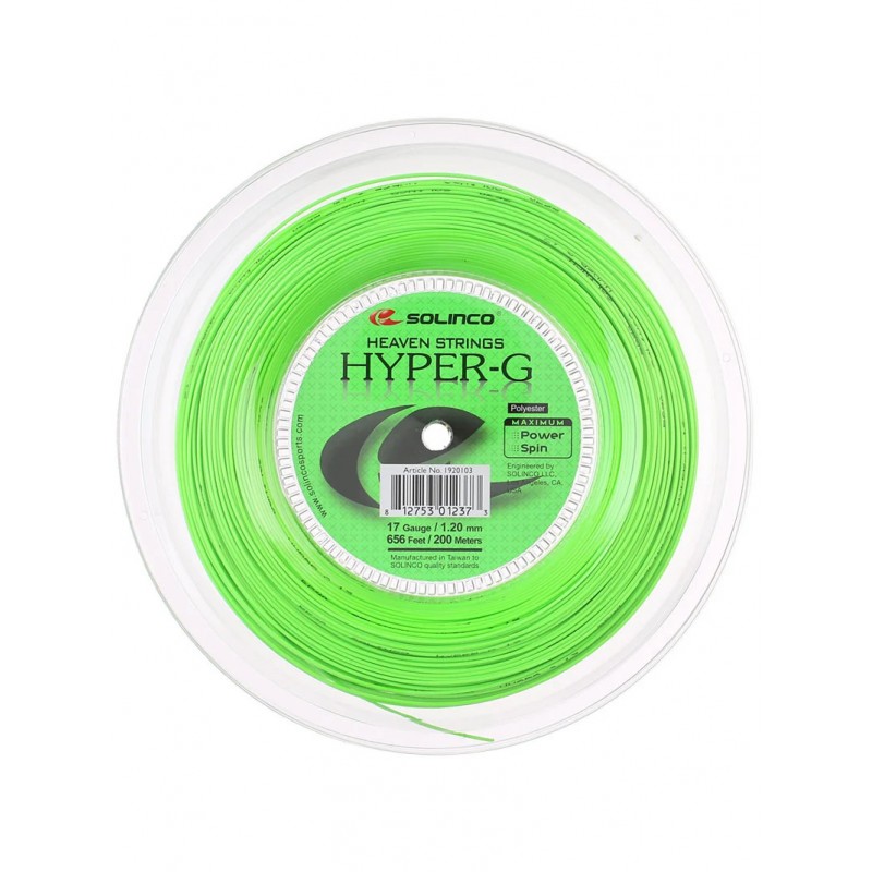 Solinco Hyper-G este un co-polimer în formă pătrată, cu o combinație impresionantă de efect și precizie. Dezvoltat pentru un jucător din top 50 ATP, această coardă de duritate medie le permite jucătorilor puternici să lovească mingea cu forță, fără să se îngrijoreze de supralovire. Jucătorii de topspin care adoră să lovească mingi ce plonjează brusc și sar de pe teren ar trebui să aprecieze această coardă.